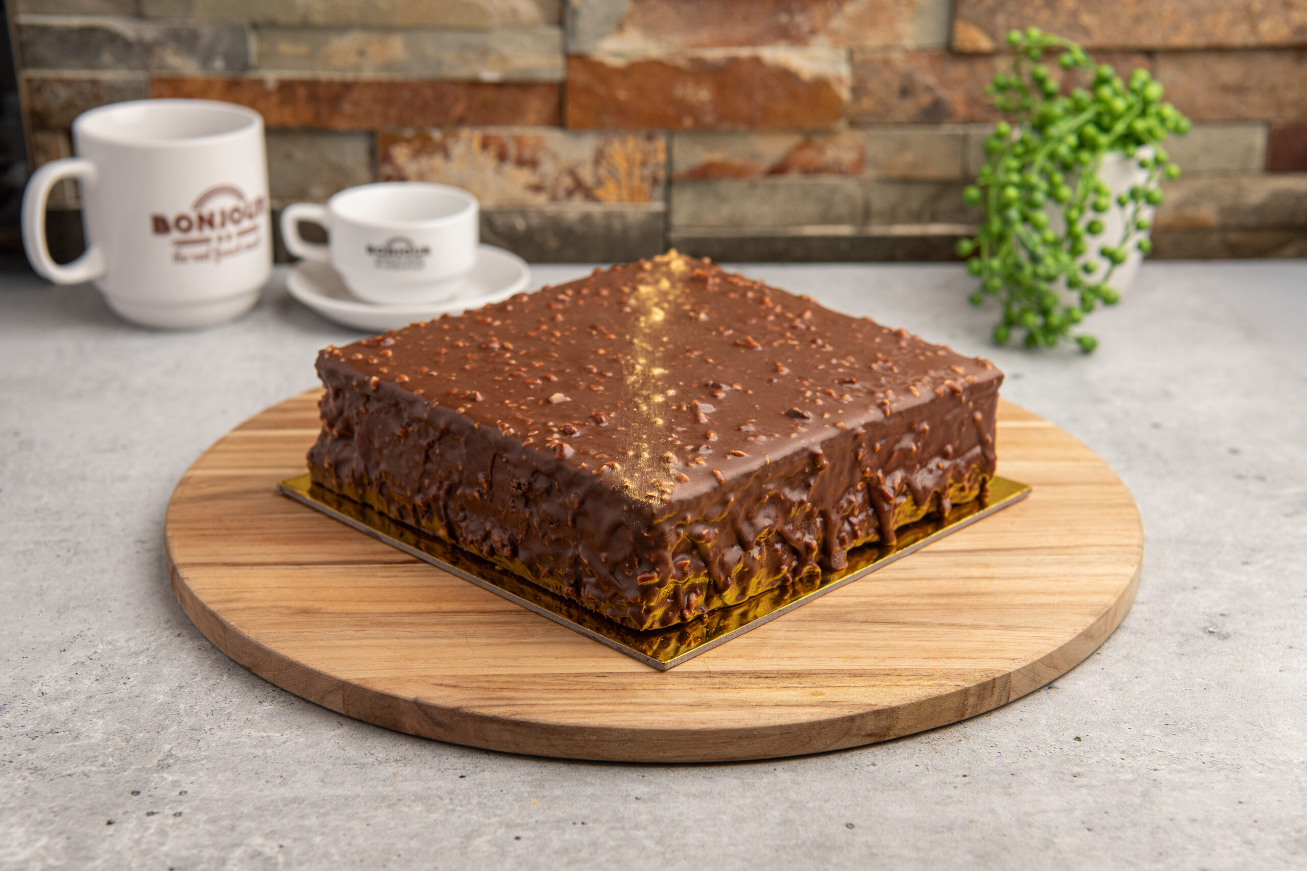 A soft layer of marshmallow blends with the intense flavor and crunchy texture of pistachios and traditional kataifi. Covered with a lustrous chocolate glaze with pieces of crispy almonds.
