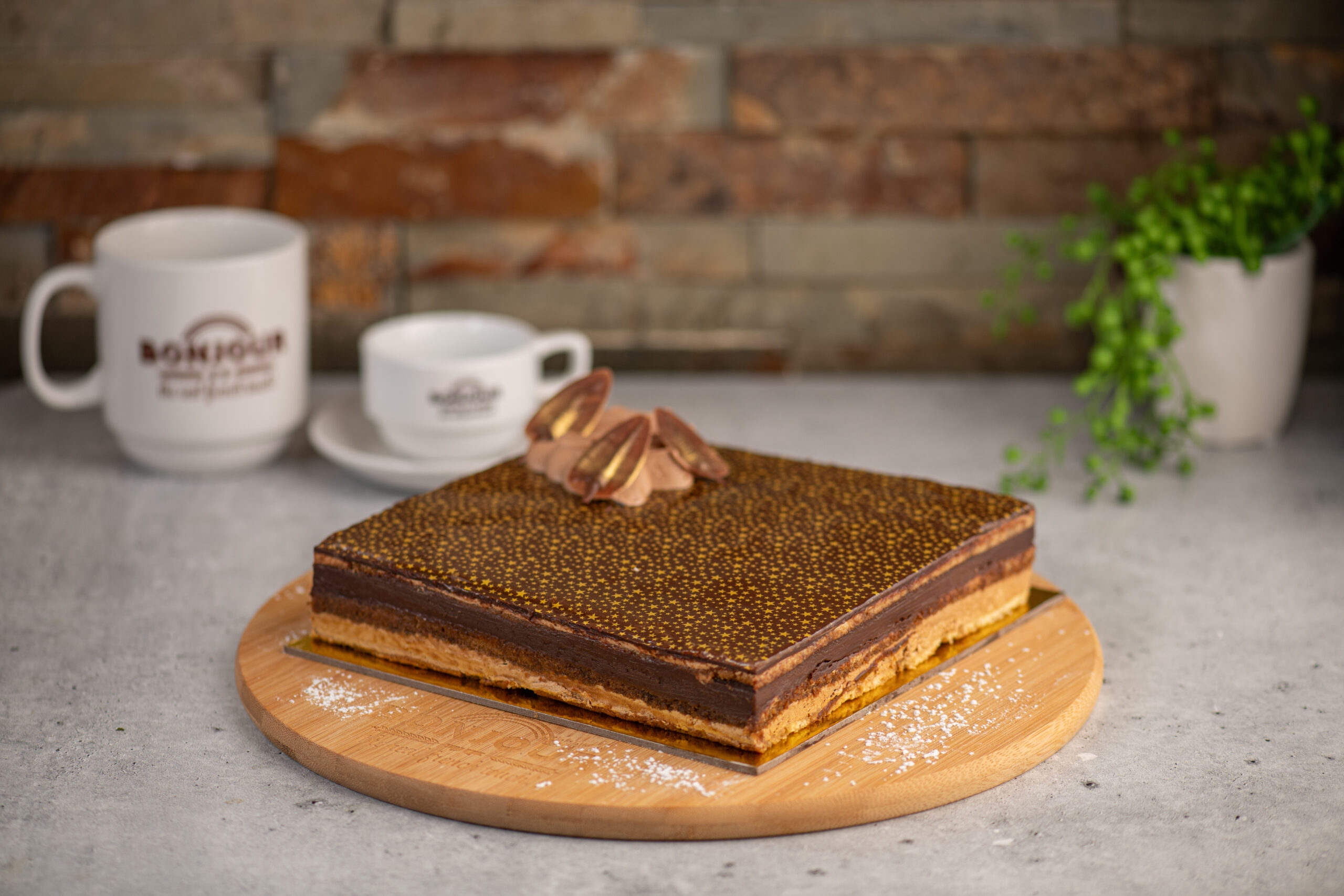 Layers of coffee flavored cake, almond cream and dark chocolate ganache.
